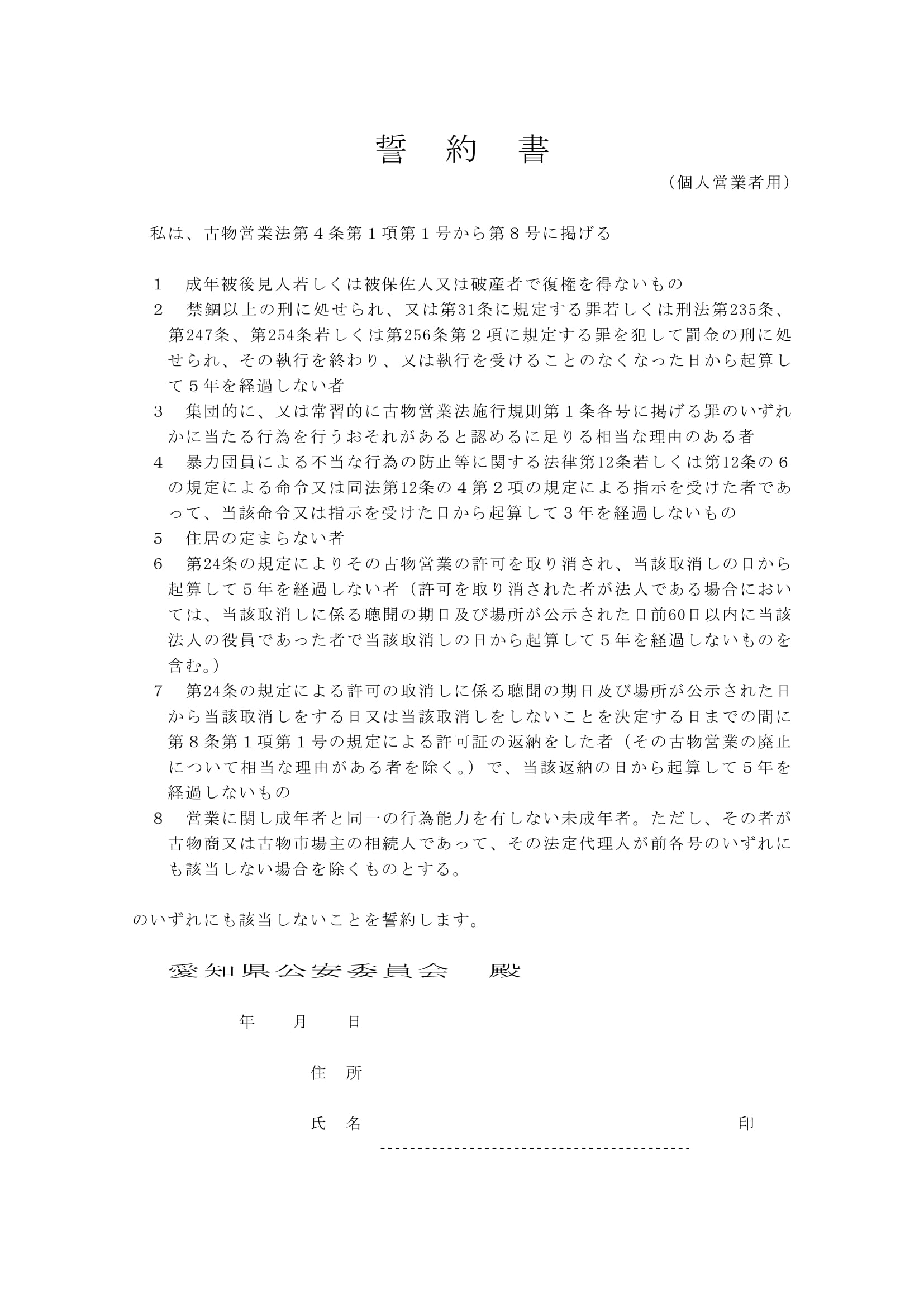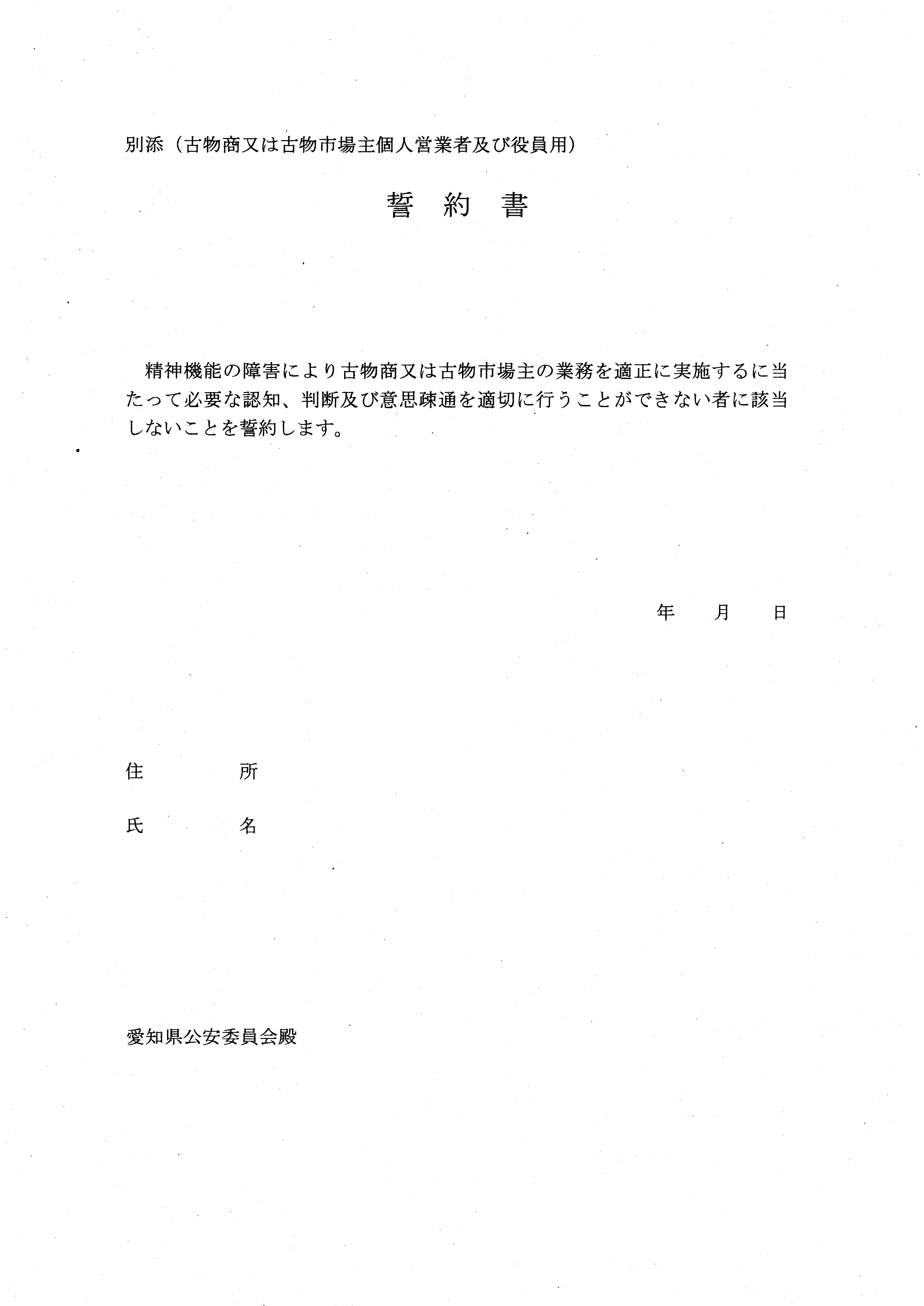 令和元年12月14日より古物営業法の一部改正が施行されて、欠格要件から成年被後見人と被保佐人が除外されることとなりました!具体的には誓約書の書式が新しくなります。せっかくなので今までの誓約書と見比べてみましょう。